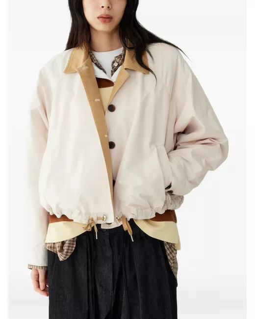 light beige corduroy collar front button fastening raglan sleeves side welt pockets drawstring hem