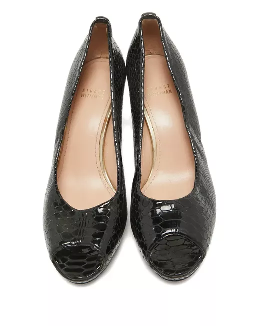 black leather slip-on style peeptoe design branded insole stiletto heel Condition: GOOD. This previously owned and used item is in good condition with minimal signs of use. This may include fading of material or plating and scratches.