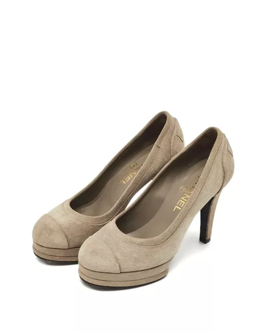 beige suede cap toe platform sole logo at rear quilted detail at rear Condition: GOOD. This previously owned and used item is in good condition with minimal signs of use. This may include fading of material or plating and scratches.