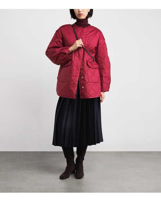 Displaying diamond quilting across a deep red base, mm's Mmlspiga jacket is insulated with luxepad. This is an exclusive padding that fuses the scraps recovered from the production of coats with recycled polyester, resulting in a truly warming barrier.
