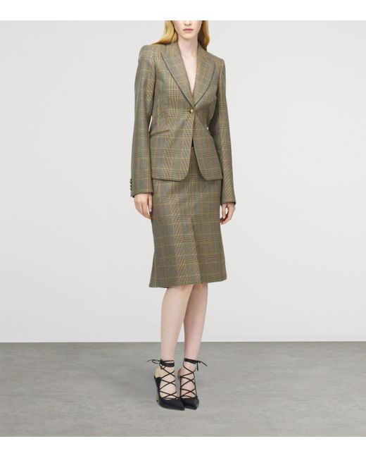 McQueen reimagines traditional British country checks through its sculptural lens with this striking midi skirt. Tailored in a structured weave that holds its shape, the design features a clean front slit and subtle kickback detailing that encourages movement while maintaining sharp lines. The result? A piece that nods to heritage tailoring but delivers it with the brand's unmistakable edge.