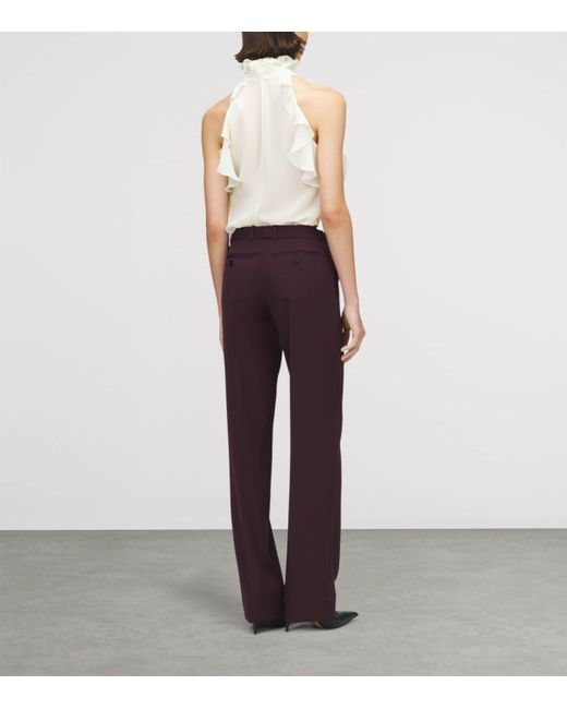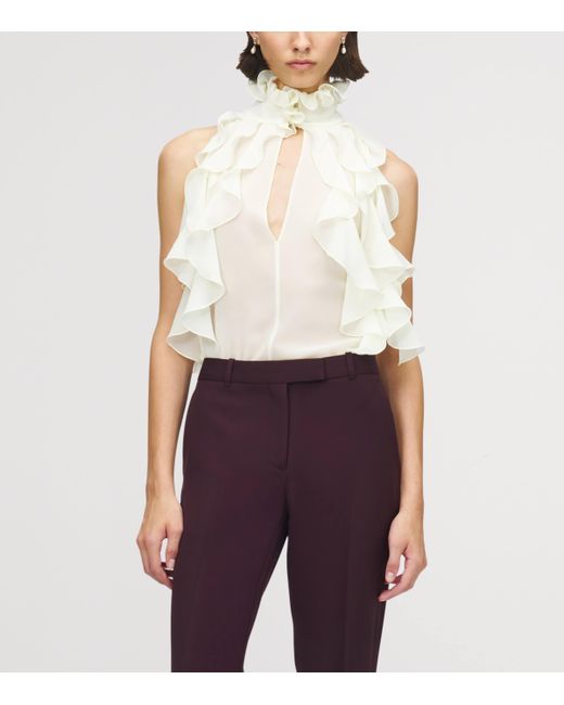 Ruffles, layers and delicacy are at the forefront of this blouse by McQueen, hailing from the brand's Autumn/Winter 2025 collection, inspired by the flouncing fashion of dandyism. Here, the neo-dandy is imagined through ruffles that adorn its high-neck silhouette, bringing texture and depth that juxtapose silk's lightweight quality.