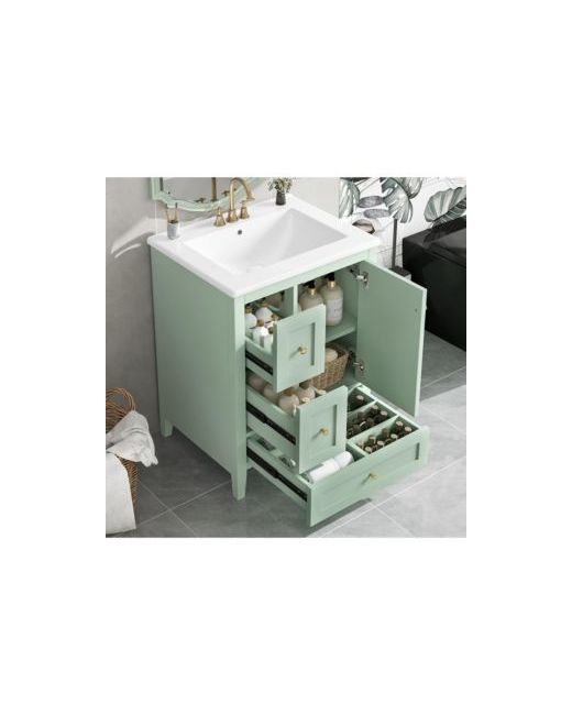 Ideal for small to medium bathrooms, this 24-inch vanity features durable Mdf construction with solid rubberwood legs and a 150 lb weight capacity. Its versatile storage includes two top drawers, a large divided bottom drawer, and an adjustable shelf cabinet. The sleek finish and modern hardware enhance any decor, while the space-saving design (33.9"H) ensures easy installation and maintenance for a functional bathroom upgrade.