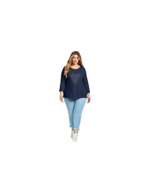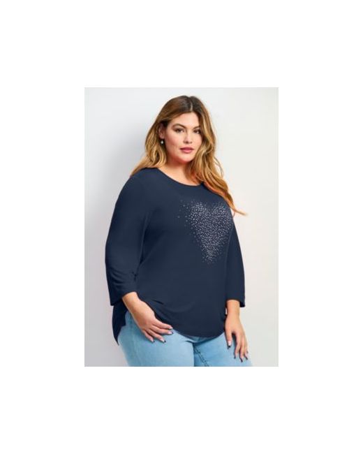 Get ready to turn heads with the Love Heart Top. This trendy piece combines a round neckline with 3/4 sleeves, making it the perfect blend of comfort and style. Crafted from stretch jersey viscose elastane, its eye-catching nailhead placement print is bound to make a statement. Whether you're dressing up for a night out or keeping it casual for a day in, this top is all about breaking the rules and stealing the spotlight. Fabric: 95%Viscose 5%Elastane Care: Machine Wash Key Features Include: 95%Viscose 5%Elastanecb Length: Regular 26". Plus Sizes 14-32Avenue. Round Neckline3/4 sleeves. Pull on fit. Diamonte placement print. Imported