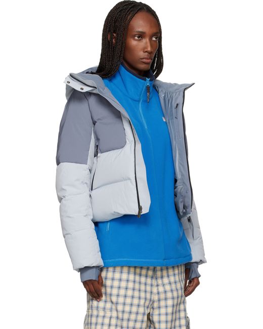 Down-filled and quilted 2L DryVent™ recycled taffeta and ripstop jacket. · Water-repellent, non-PFC DWR coating · Wind-resistant · Recycled down · Concealed bungee-style drawstring at hood and hem · Zip closure · Rubberized logo patch at chest and back · Zip pockets at waist · Mesh zip vent at underarms · Logo-printed trim at sleeves and back yoke · Zip pocket at sleeve · Thumbhole at inset rib-knit cuffs · Zip and patch pocket at interior · Powder skirt at interior · Full taffeta lining Supplier color: Blue flax/Twilight galaxy
