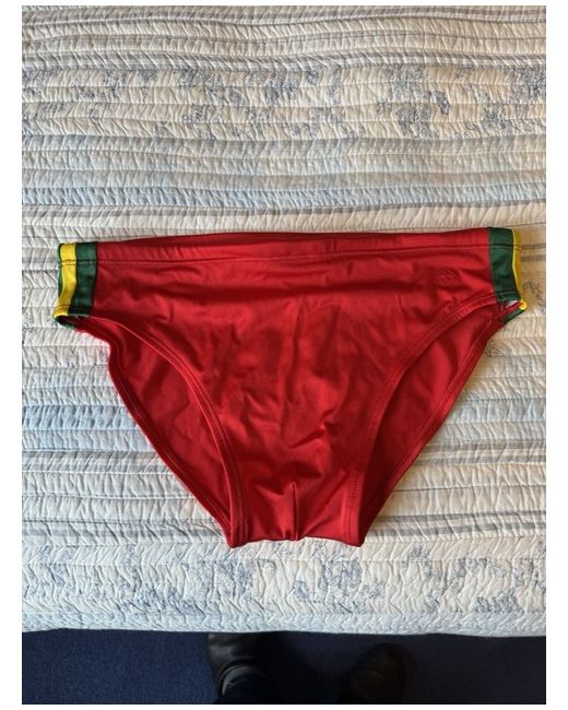 These Genuine vintage Gucci Swimming Trunks in size large (32inch) are stylish and sleek, perfect for men looking for a very brief skinny swim bottom style. The vibrant red colour adds a touch of personality to your pool or beach look, while the machine washable fabric makes it easy to keep clean and fresh. Made by the prestigious brand Gucci, these swim shorts are a luxurious addition to your swimwear collection. They have never been worn They are marked large but very skinny