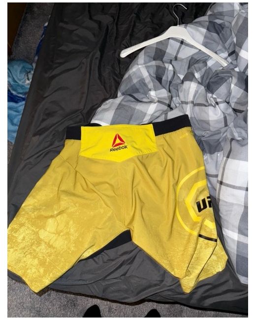 The product is a pair of UFC Reebok shorts in size medium, designed for men. The shorts are bright yellow in colour with a flat front design and a polyester material. The Reebok logo is featured as an accent, making them a stylish choice for fans of the sport. With a waist size of 32 inches, these shorts offer a comfortable fit for regular wear. Ideal for both training and casual wear, these shorts are a must-have for any MMA enthusiast.