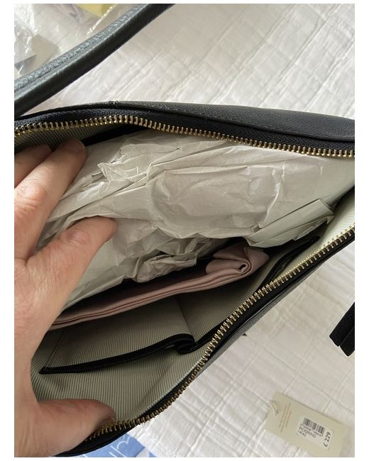 This rectangular shoulder bag features a zip closure and a convenient inner pocket for organization. The exterior is crafted from sleek black leather with a fabric lining in beige, making it perfect for casual occasions.
