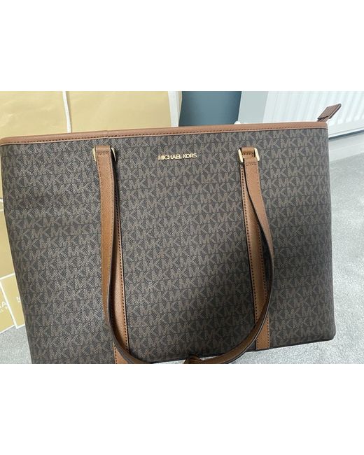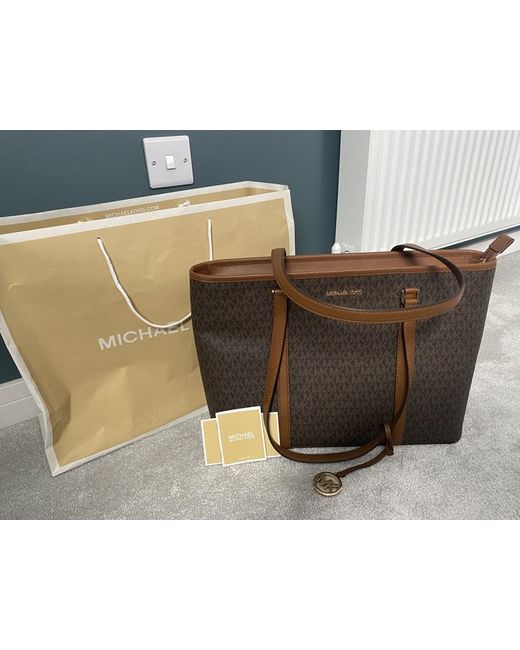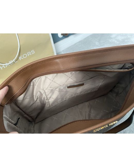 The Michael Kors Women's Large Bag is a stylish and practical accessory for everyday use. This rectangular shaped bag features a zip closure, double handles, and a fabric lining. Made from luxurious brown leather with gold hardware accents, this tote design is part of the Michael Kors Jet Set Travel collection. It also includes inner pockets for organization and a charming bag charm. Perfect for casual occasions, this designer bag adds a touch of elegance to any outfit. Never been used. Perfect Christmas present