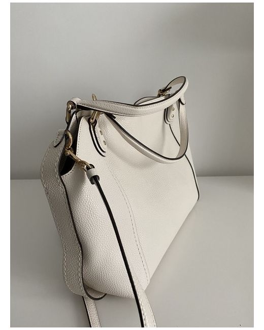 A beautiful Coach handbag in polished pebble leather. Never used. Colour: cream with dark brown edges. Snap closure for main compartment. Detachable strap for shoulder or crossbody wear. Two inside pockets - one with a zip, one without. Comes with original dust bag.