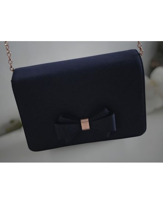 The Ted Baker Bow Clutch Bag is a stylish and elegant accessory perfect for a party or cocktail occasion. Made from luxurious blue leather with gold hardware accents, this small rectangular clutch features a magnetic closure and a detachable strap for added versatility. The iconic bow detail adds a touch of feminine charm to any outfit, making it a must-have for any fashion-forward woman's collection. The Ted Baker brand ensures quality and sophistication in this chic and practical clutch bag.