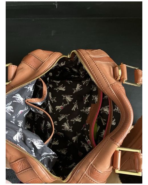 New Ted Baker bag has slight marks and scratches. It’s in very good condition has a dog pattern on the inside. Has loads of room on the inside for all your stuff has compartments on the inside. Comes with the protective bag to keep it clean.