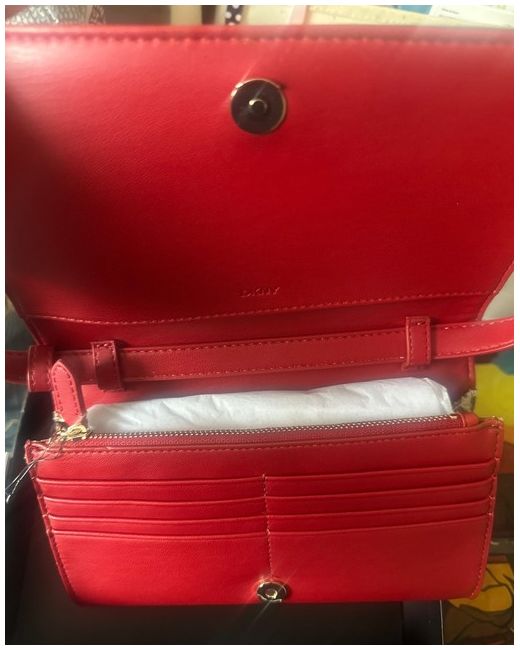 It features a secure zip closure, adjustable and detachable strap, and the iconic DKNY logo for a fashionable finish.