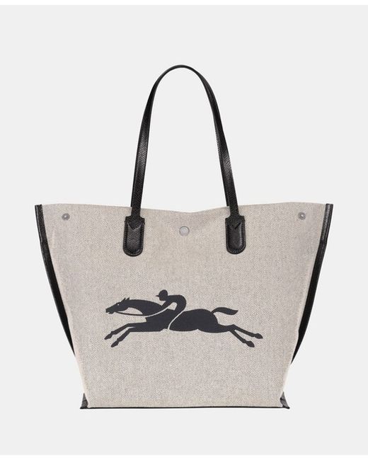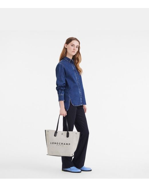 Longchamp L Essentials Bag Canvas - Ecru Dimensions : 32 cm (L) x 32 cm (H) x 17 cm (W) / 12.6 in (L) x 12.6 in (H) x 6.7 in (W) Material : Flecked cotton canvas Metallic Hardware : Silver color Trimming : Grained cowhide leather Weight : 704 g / 1.55 lb Closing : Snap closure INTERIOR DETAILS Zipped pocket : 1 Flat pocket : 2 RRP £350
