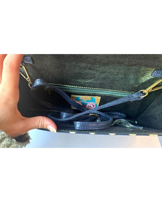 Blue fabric upper with polka dot design main and floral design accents. Floral bow on closure panel. Green inner fabric.