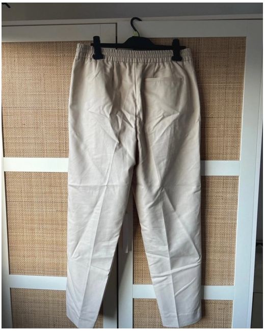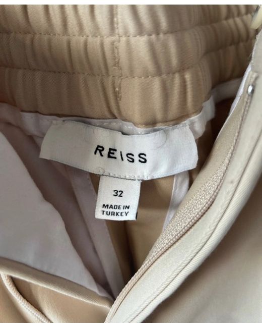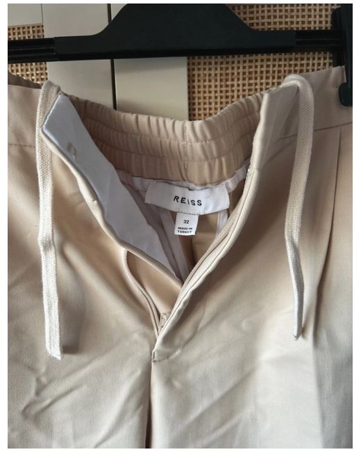 These Reiss Drawstring Pleated Trousers in size W32 feature a stylish chino style with a flat front design. Made from machine washable material, these beige trousers are perfect for the spring season. The zip and drawstring closure adds a modern touch to this classic piece, suitable for both men and women. Made by the well-known brand Reiss, these trousers offer a comfortable and on-trend option for everyday wear.