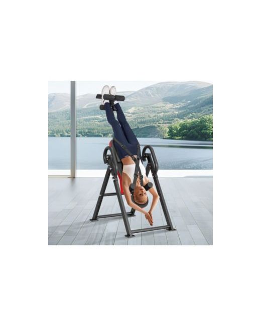 This heavy-duty inversion table supports up to 300 lbs and features adjustable height, a secure ankle lock, double safety belts, and removable shoulder rollers for comfort. Its foldable steel frame saves space, while ergonomic details ensure safe, controlled inversion for effective back stretching and decompression.