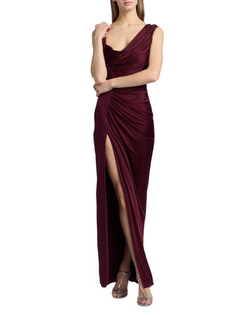 Crafted of satin, this Versace evening gown is styled with a cowlneck, elegant draping at the back, and Medusa hardware at the straps. Cowlneck Fixed straps Scoopback Side slit 100% viscose Lining: 74% acetate/26% viscose Dry clean Made in Italy SIZE & FIT Model measurements: 5'10" tall Model is wearing US size 4 ABOUT THE BRAND Founded in 1978, Versace is instantly recognizable by the signature Medusa head logo, chosen by founder Gianni Versace for its Greek symbolism. The Italian label is known for its luxe, bold clothing and accessories-think gilding, oversized logos and punchy prints. Since taking over artistic direction, Gianni's sister Donatella Versace has maintained the brand's strong identity, with a renewed vision to give customers the ultimate freedom to express themselves. Advanced European - Versace > Versace > Saks Fifth Avenue. Versace. Color: Burgundy. Size: 2.