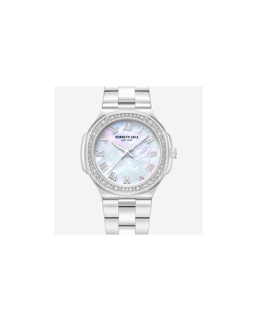 WHAT’S IN IT FOR YOU? Bracelet watch Mother of Pearl dial Crystal-lined outer dial Understated luxurious style Roman Numeral hour markers Stainless steel bracelet strap Kenneth Cole logo detail 2-year battery life 3ATM water resistance Imported | Kenneth Cole | Classic Crystal Lined Outer Dial Stainless Bracelet Watch in SILVER