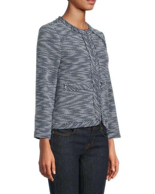 Crafted of textured woven stripes, the Clarice jacket from rag & bone features a timeless boxy silhouette finished with frayed trim. A concealed closure and welt pockets finish the look. Crewneck Long sleeves Side welt pockets Button-front closure 55% cotton/39% polyester/1% elastane/1% other fibers Dry clean Imported SIZE & FIT About 22.5" from shoulder to hem Bust: about 36" Model measurements: 5'10" tall Model is wearing a US size Small Please note: Compared to the Saks Size Guide, this style measures true to size. ABOUT THE BRAND In 2002, rag & bone founder Marcus Wainwright combined his British heritage with a downtown-New York aesthetic to set the tone for the label. At the heart of the edgy-yet-laid-back brand is its focus on quality craftsmanship and attention to detail. The epitome of cool, off-duty style, it's no wonder the signature second-skin denim is favored by many. Contemporary Sportswear - Rag And Bone > Rag & Bone > Saks Fifth Avenue. rag & bone. Color: Navy Multi. Size: Medium.
