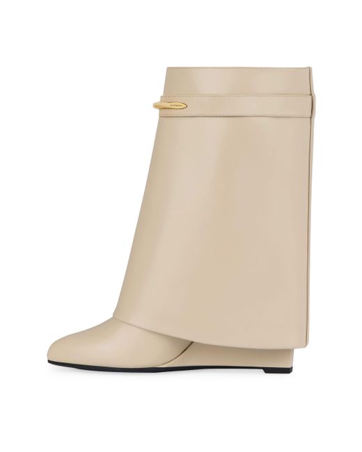 Shark boots in leather. Boots in calfskin leather Shark line Metal pin with Givenchy engraved Golden-finish metal details Pointy toe Covered wedge heels Straight pants designed for versatile wear and an optimal fit Heel height: 3.7 in. Composition: 100% calfskin leather Fits small. Take one full size up Made in Italy. Lsd Rtw - Givenchy Rtw > Givenchy > Saks Fifth Avenue. Givenchy. Color: Beige. Size: 6.