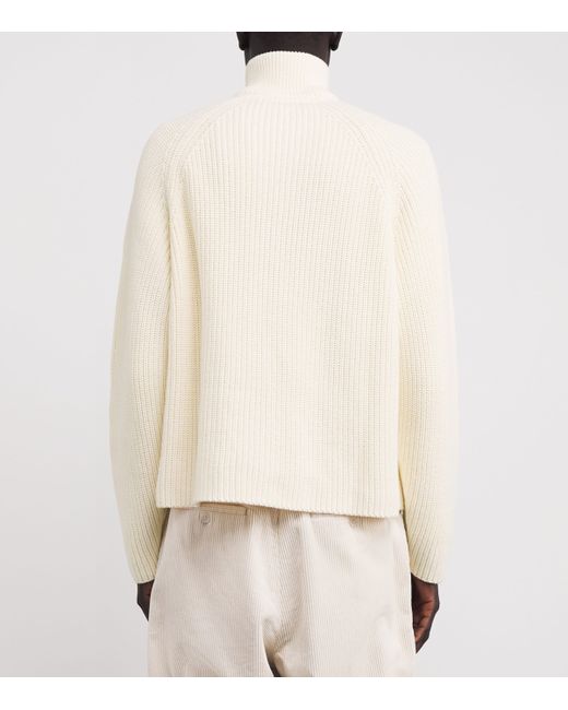 Approaching its seasonal knitwear, about:blank crafts it around two pillars of perfection: form and versatility. Crafted from chunky five-gauge cotton knit, this funnel-neck half-zip sweater beautifully maintains its raglan sleeve profile and effortlessly layers on its own or under heavier outer garments.