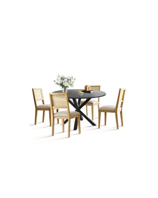 Elevate your dining space with this 5-piece set that blends bold contrast and textures. The 39.4 round black Mdf table features a starburst-style base for a sculptural, modern look. Four matching chairs combine sleek black frames with natural faux rattan backs and soft cushioned seats, offering a warm-meets-cool aesthetic. Designed for both style and comfort, this set brings visual interest to apartments, kitchens, or breakfast nooks. The mix of dark wood tones and woven textures creates a striking focal point in any small space while remaining cozy and inviting for everyday meals.