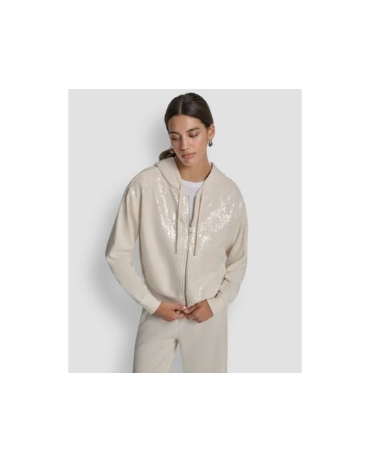 Offering all-day comfort, this Dkny Jeans jacket is a must-have for your seasonal collection. Featuring a drawstring hood, relaxed fit, and long sleeves, it perfectly blends sparkle with casual ease.