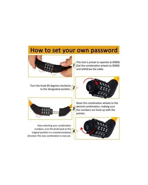 This durable 4-digit combination lock features a high-strength engineering plastic shell and a flexible 2-foot steel cable with Pvc coating for cut resistance and scratch protection. Offering keyless convenience, it comes preset to 0000 but allows users to reset to any personalized combination (must be remembered as the lock doesn't restore defaults). Ideal for securing bicycles, skateboards, tools, fences and sports equipment, its compact design balances security with portability. The manufacturer provides dedicated customer support for any inquiries.