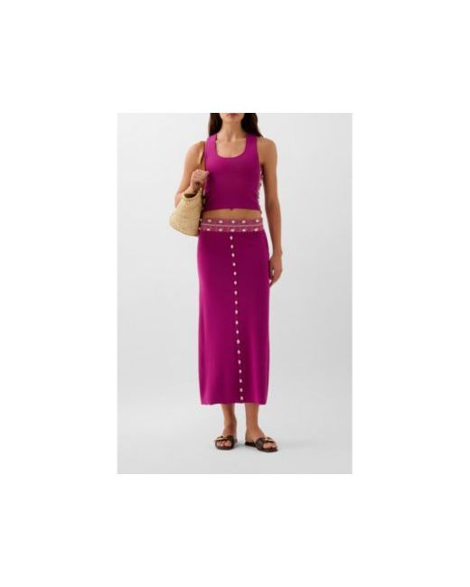 Long knitted skirt. Contrast embroidered waistband. Shell detail on waist and front.