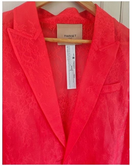Organza blazer with lace lining, arrow lapels and single button closure.
