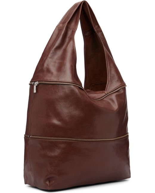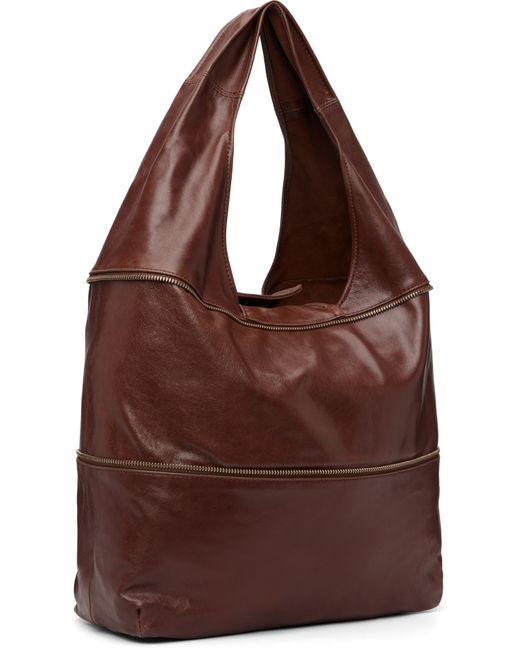 Crinkled buffed leather shoulder bag. · Zip expansion panel · Fixed shoulder strap · Embossed logo at face · Magnetic closure · Patch pocket and clasp-on-lanyard at interior · Unlined · H6.75” x W18.5” x D5.25” · Total height: H12.5 Supplier color: Brown