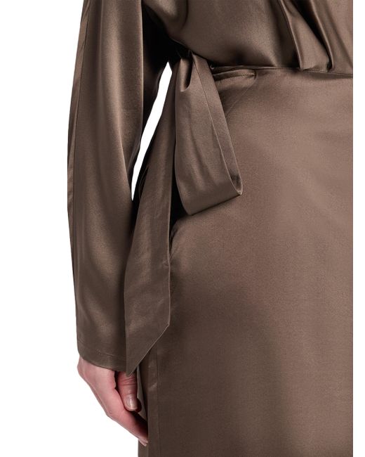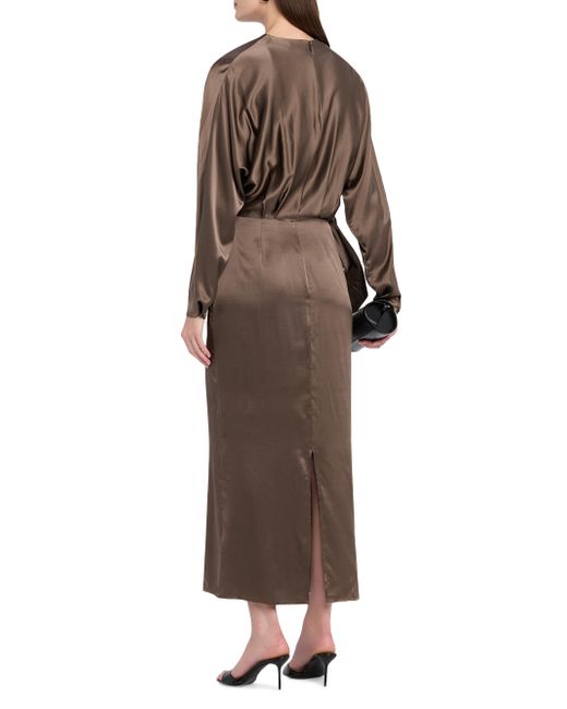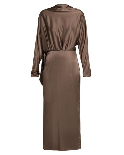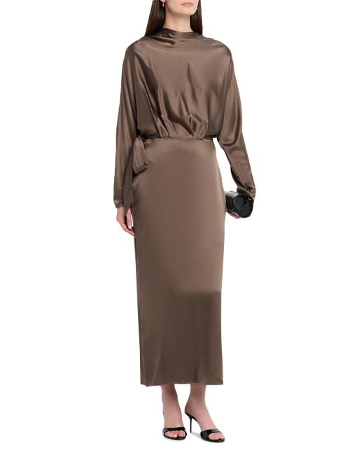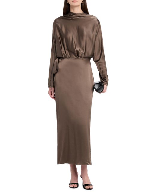 Crafted of a silk blend, Staud's Phoebe midi-dress is designed with a draped neck and sleeves, and an embellished bow detail at the waist. Drapeneck Long sleeves, draped Button cuffs Back slit Back zip closure 93% silk/7% spandex Dry clean Imported SIZE & FIT Column silhouette Model measurements: 5'10" tall Model is wearing a US size 4. Contemporary Sportswear - Contemporary Collections > Staud > Saks Fifth Avenue. Staud. Color: Truffle. Size: 0.