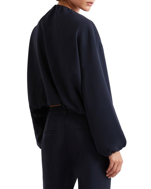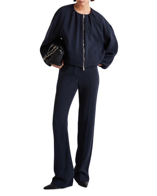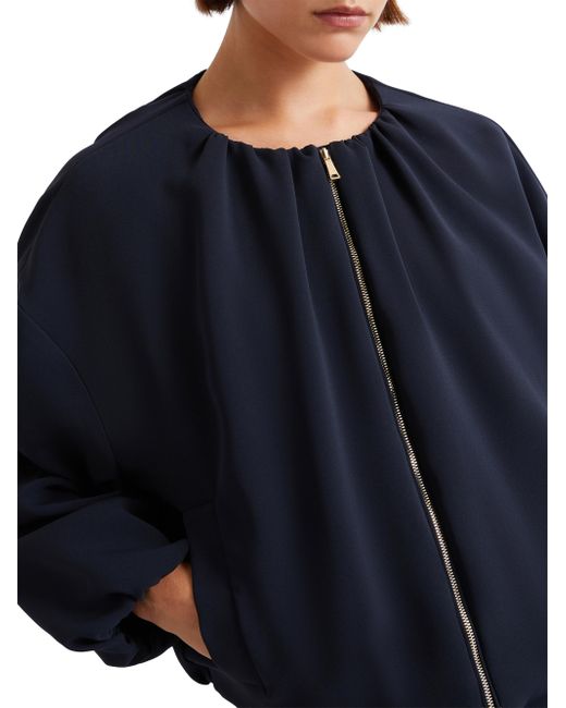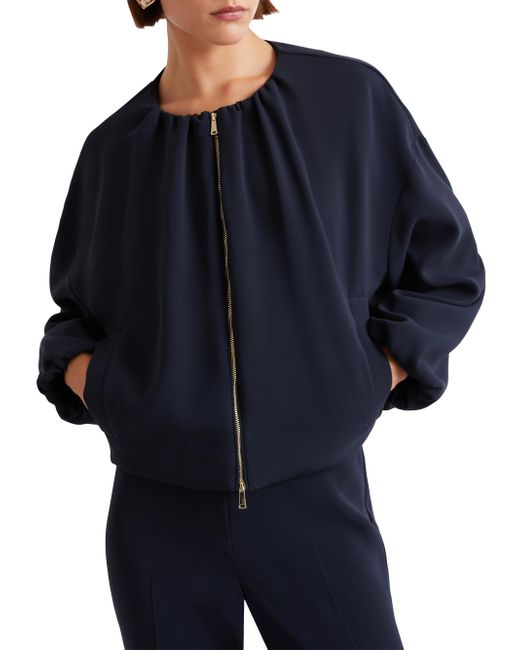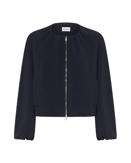 Lined technical cady jacket. Relaxed fit Gathered round neckline Front zip fastening 3/4 sleeves with elasticated cuffs Welt side pockets Fabric 65% triacetate, 35% polyester lining 64% acetate, 36% polyester Machine wash cold delicate cycle, do not bleach, do not tumble dry, line drying in the shade cool iron professionally dry clean perchloroethylene - mild process, wash the garment while it is fastened, protect zipper tongue and slide before cleaning Imported. Lsd Rtw - Womens Rtw Lsd Mp > Marella > Saks Fifth Avenue. Marella. Color: Navy. Size: 2.