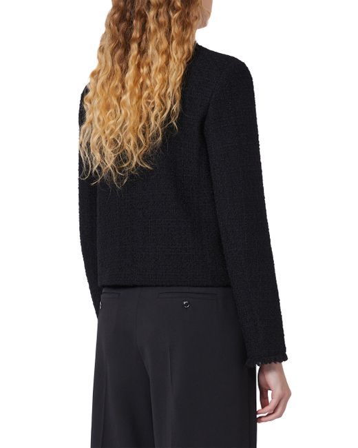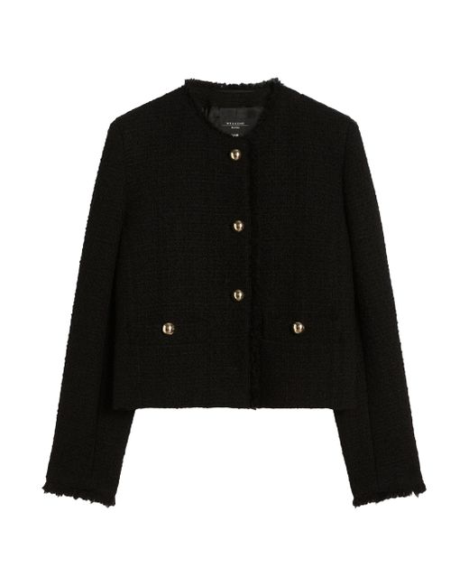 Single-breasted cropped jacket with a distinctive slightly embossed texture and fringed trims. Wool-blend fabric jacket Straight fit Crew-neck and long sleeves Metal button fastening on the front Welt pockets with metallic button Lined model Fabric 93% virgin wool, 7% polyester, lining 50% acetate, 50% viscose, sleeves lining 65% acetate, 31% polyamide, 4% elastane Do not wash, do not bleach, do not tumble dry, cool iron, professionally dry clean perchloroethylene - mild process, do not wet clean, wash the garment while it is fastened, do not iron the buttons, protect buttons before washing, turn the articles inside out before washing, contains non-textile parts of animal origin Imported. Lsd Rtw - Womens Rtw Lsd Mp > Weekend Max Mara > Saks Fifth Avenue. Weekend Max Mara. Color: Black. Size: 0.