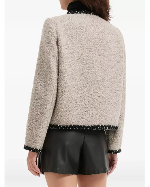 beige contrast trim button fastening two front patch pockets round neck long sleeves
