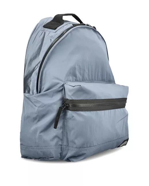 blue front zip pocket top carry handle adjustable shoulder straps logo patch zip closure