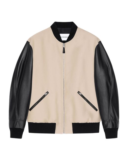 Mix material blouson jacket with Givenchy Paris embroidery. Blouson in cotton with nappa leather sleeves Bomber collar Givenchy Paris signature in leather embroidered on the back Zipped closure with leather zip puller Two side pockets with leather piping Elasticated knitted collar hem and cuffs Couture seams for a rounded proportion Relaxed fit Lining with all-over Givenchy Paris jacquard Composition: 100% cotton Secondary material: 100% lambskin Lining: 100% cupro Made in Italy. Lsd Rtw - Givenchy Rtw > Givenchy > Saks Fifth Avenue. Givenchy. Color: Black Beige. Size: 36.