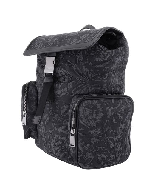 This large canvas drawstring backpack with leather trims features an allover tonal jacquard Barocco pattern two front zipped pockets and an internal pocket with a light padding for safe laptop storage The versatile style is complete with a front tuc closure with a Versace Logo detailing- Barocco pattern- Versace Logo motif- Front tuc closure- Top drawstring closure- Front zip pockets- Internal zip pocket- Internal slip pocket- Adjustable shoulder straps- Mesh back- Outer composition: 57% Nylon, 37% Cotton, 6% Polyester- Lining: 100% Cotton- Trim 1: 100% Nylon- Trim 2: 100% Polyester