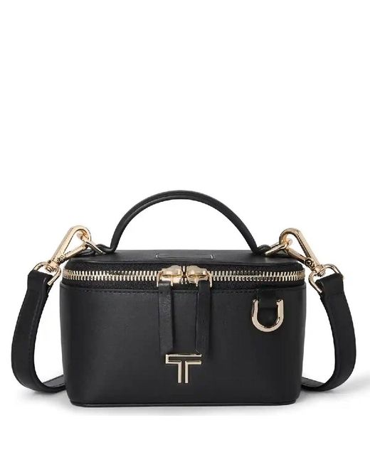 Tumi Ladies Crossbody. SKU: 0196675DLGL. Color: Black/Light Gold. Size: L 5.51 X H 3.54 X W 3.94. Tumi Lex Leather Mini Train Case Crossbody. This crossbody features a wipeable main compartment lining, 2 zip pockets (1 with microfiber lining), 3 slip pockets, and a hidden TUMI Tracer with leather flap. External details include a double-zip entry, leather top handle, removable & adjustable leather crossbody strap, and a monogram patch. Material: Leather. Made in Vietnam.