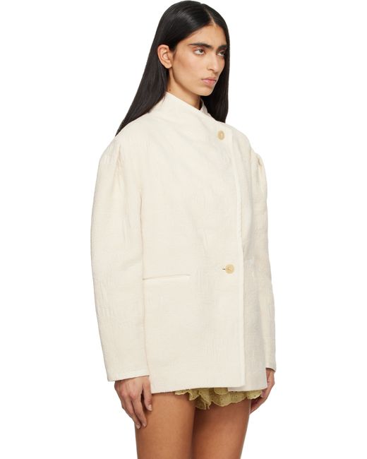 Cotton hopsack jacket. · Jacquard graphic pattern throughout · Stand collar · Button closure · Welt pockets at front · Pleat at shoulders Supplier color: Ecru