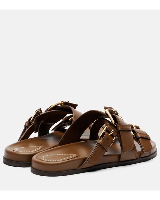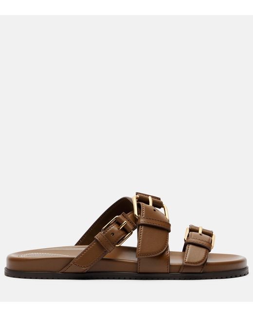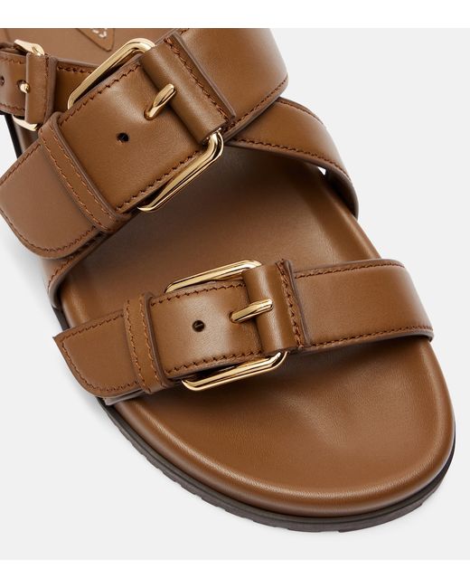 Upper: calf leather. Lining: leather. Sole: leather insole, rubber sole. Toe shape: round open toe. Made in Italy. Includes: dust bag, shoe box. Designer color name: Moss. Item color: brown. Hardware color: gold. Closure: buckle fastening.