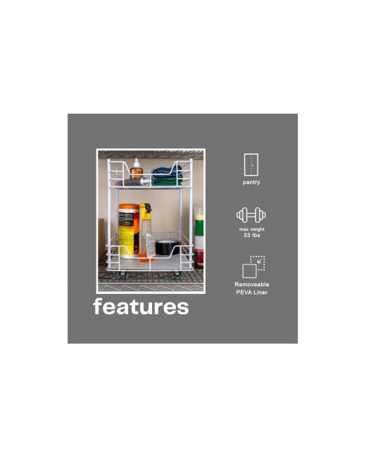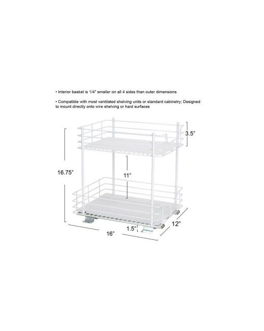 This innovative organizer is designed to streamline storage, making it the perfect solution for organizing a pantry or under cabinet areas. This organizer features two tiers of ample storage capacity, allowing the storage of a wide range of items, from cans and dry goods to cleaning essentials. Its thoughtful design ensures that every inch of space is maximized, assisting in decluttering a pantry or cabinets and keeping everything neatly organized. Compatible with most ventilated shelving units or standard cabinetry, it can be easily mounted directly onto wire shelving or hard surfaces, providing a secure and stable storage solution that fits a variety of specific needs.
