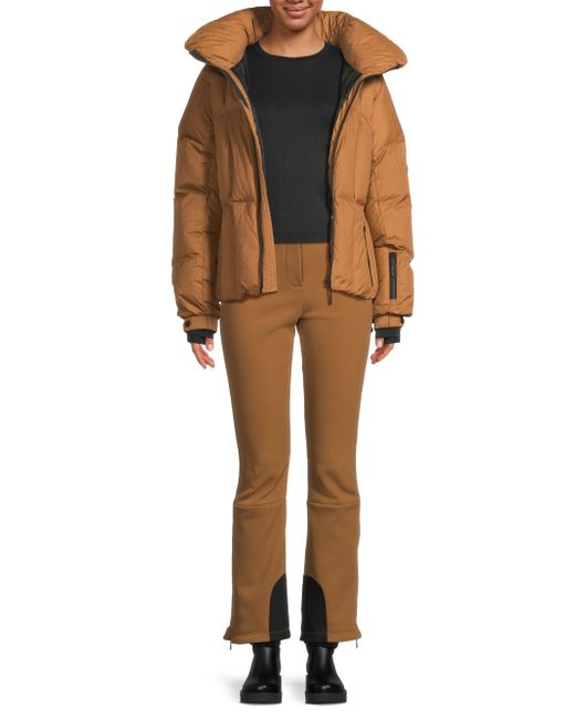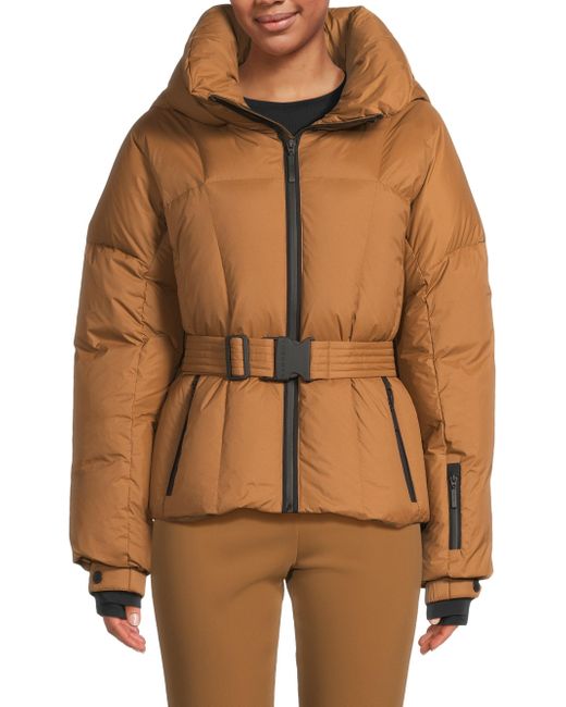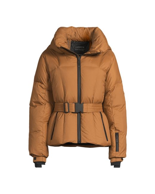 Cordova's Monterosa jacket features a soft matte shell and a fitted down-filled cut with a detachable belt, AquaGuard waterproof zippers, and sleeve gaiters. The design includes a ski pass pocket on the sleeve. Hood Stand collar Long sleeves Belted Sleeve pocket Side zip pockets Interior pocket Front zip closure Shell: 100% nylon Lining: 100% polyamide Fill: 90% duck down/10% feathers 700 fill power Machine wash Imported SIZE & FIT About 25.5" from shoulder to hem Model measurements: 5'10" tall Model is wearing a US size Small. Outerwear And Swimwear - Down > Cordova > Saks Fifth Avenue. Cordova. Color: Sepia. Size: Large.