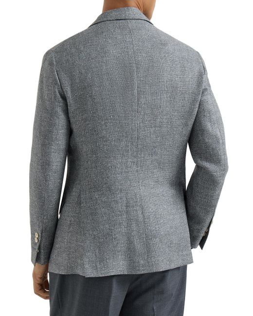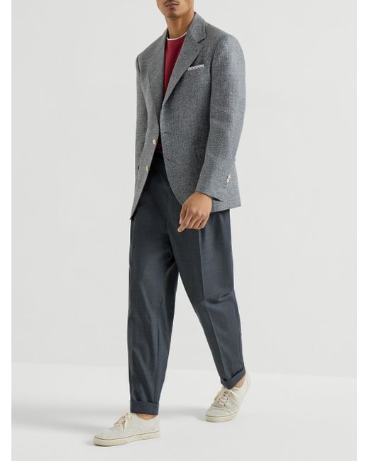 Silk, linen and wool hopsack deconstructed Cavallo blazer. 3-roll-2 closure with horn buttons Notched lapel Cuffs have four horn buttons and functional buttonholes Welt pockets with flap, ticket pocket with flap and chest pocket Cupro half lining Two interior pockets with button closure and pen holder Double back vent Drop 7 Request dry cleaning at specialist cleaner's only, do not bleach. Do not tumble dry, iron at low temperature 49% silk, 31% linen, 20% wool Made in Italy. Lsd Rtw - Brunello Cucinelli Rtw > Brunello Cucinelli > Saks Fifth Avenue. Brunello Cucinelli. Color: Medium Grey. Size: 32.