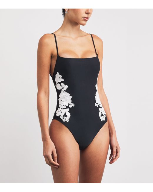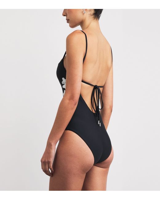 simkhai explores botanical embroidery this season, utilising artisanal techniques to create its designs. The Juniper swimsuit provides a striking canvas for the brand's expressive style, contrasting against the white ribbons - which are manipulated into place by hand and finally hand-stitched to produce silky three-dimensional petals.