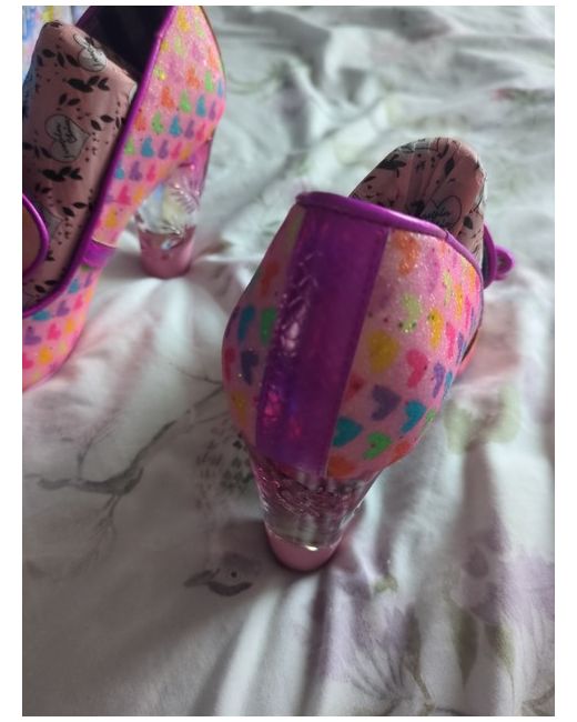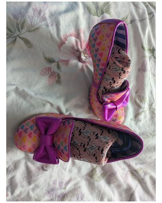 The Irregular Choice Ozzo Pink Shoes in size 6 are a stylish and playful choice for any party or cocktail occasion. These round toe court shoes feature a sweet heart pattern with a synthetic upper and lining material. The bow accent adds a touch of femininity to the design. With a standard shoe width and synthetic outsole, these pink heels are perfect for adding a pop of colour to your outfit for autumn, winter, or summer events. Made by the brand Irregular Choice, these shoes are a fun and unique addition to any woman's wardrobe. Item comes from a non- smoking home