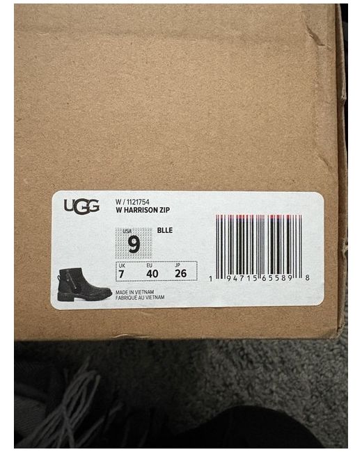 The Ugg Harrison Zip Boot in Black is a stylish ankle boot designed for women in UK size 7. Made of leather with a comfortable rubber outsole, these boots feature a convenient zip closure and a round toe shape, perfect for casual occasions in the winter season. With the renowned brand of UGG, these boots are a must-have for those looking for quality and style. New in box, unused.