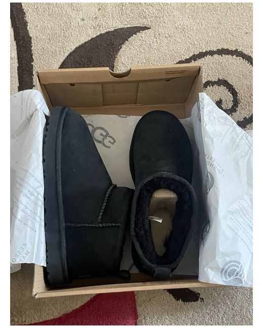 The UGG Classic Ultra Mini Women's Ankle Boot in Black, UK size 7, is a stylish and comfortable choice for casual occasions. These boots feature a round toe shape, flat heel, ankle shaft style, and are crafted with suede upper material and sheepskin lining for added comfort. With a pull-on closure and rubber outsole, these UGG boots are perfect for winter and exude a classic Australian theme. Ideal for those who value both fashion and comfort in their footwear selection.