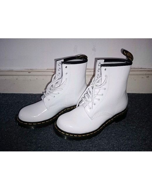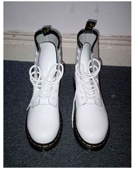 These Dr. Martens Women's White Leather Boots are a stylish and versatile addition to any wardrobe. With a round toe shape, ankle height, lace-up closure, and low heel, they are perfect for casual occasions. Made from high-quality leather with a standard shoe width, these boots feature the iconic Dr. Martens 1460 product line and are designed for women who appreciate both comfort and style. The label says they are a size 5 but they are hopelessly too small for me (beyond a case of breaking them in) so I am advertising them at a size 4 to save the next owner the sake disappointment.